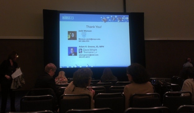 Adam Greene, JD, MPH Davis Wright Termaine and Jackie Monson, JD, CHC Mayo Clinic discussed some of the real life privacy and security challenging facing patient EFR portals at HIMSS 13.