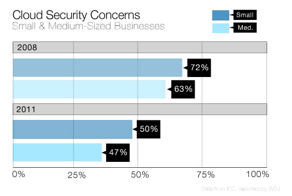 In 2008, 72 percent of small businesses (less than 100 employees) flagged security as the main reason they were not outsourcing their IT infrastructure to the cloud, while 63 percent of medium-sized businesses (100 to 999 employees) echoed their concern. But mid-2011 trends show a decrease in worries, to 50 percent for small businesses and 47 percent of medium-sized.